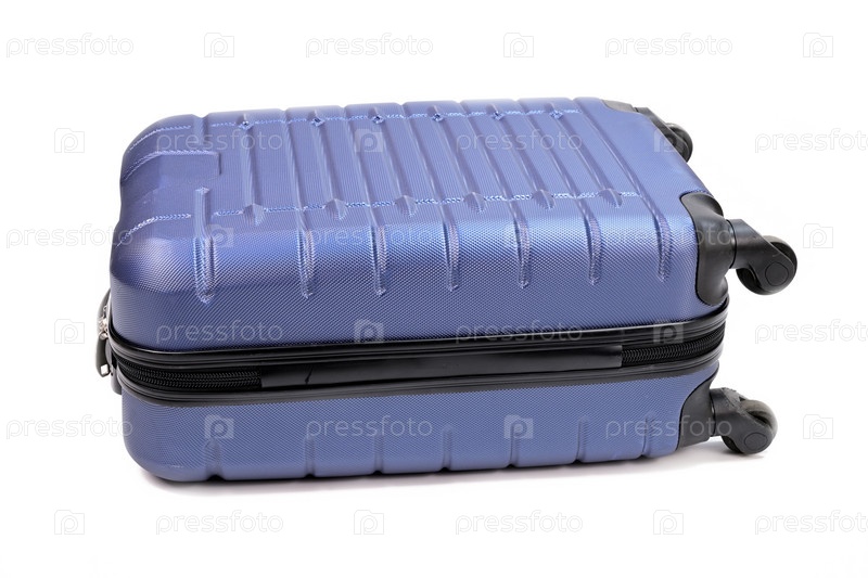 Синий пластиковый чемодан на молнии и на колесах, лежащий на боку