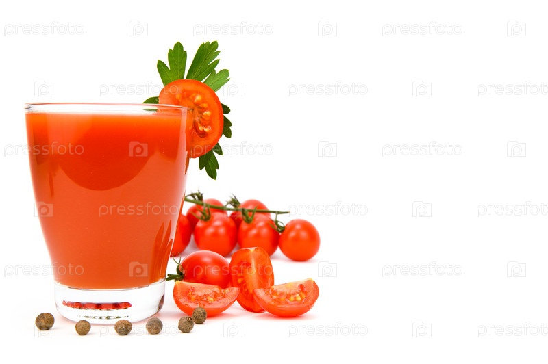Стакан томатного сока с ломтиком помидора на краю. Помидоры, петрушка и душистый перец разложены вокруг