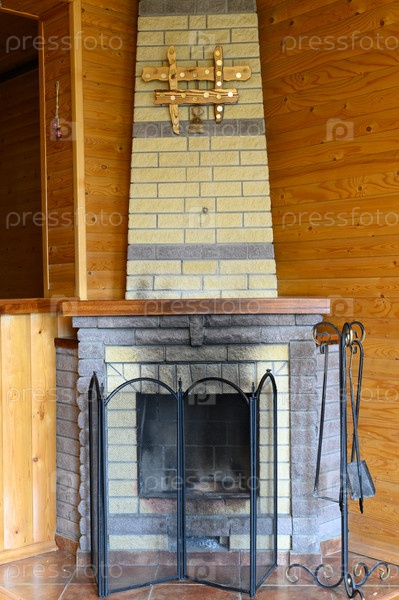 Камин из кирпича, накрытый декоративной решеткой. Рядом на стойке висят кочерга и лопатка для золы