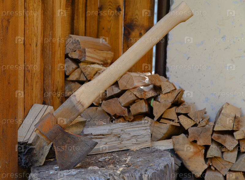Тяжелый топор со ржавчиной, застрявший в бревне, куча рубленых дров