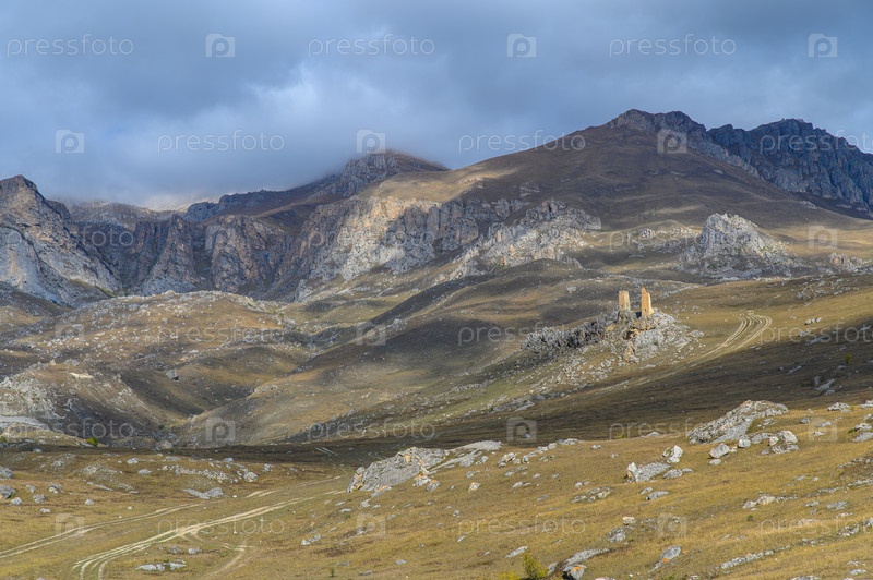 Горный пейзаж и дорога, ведущая к двум старым полуразрушенным сторожевым башням