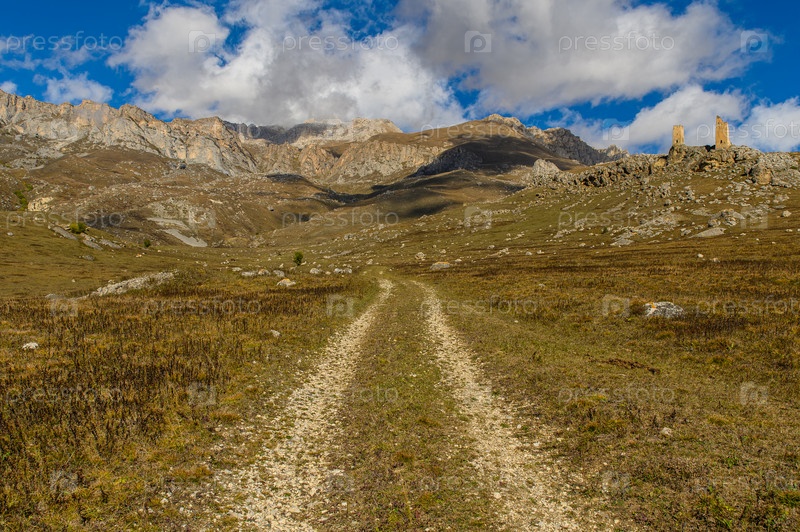 Горный пейзаж и дорога, ведущая к двум старым полуразрушенным сторожевым башням
