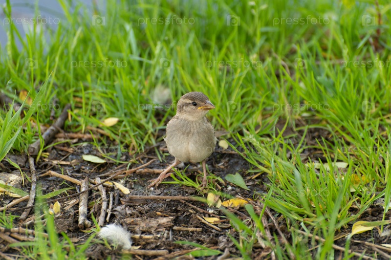 Молодой воробей ищет еду среди травы на лужайке