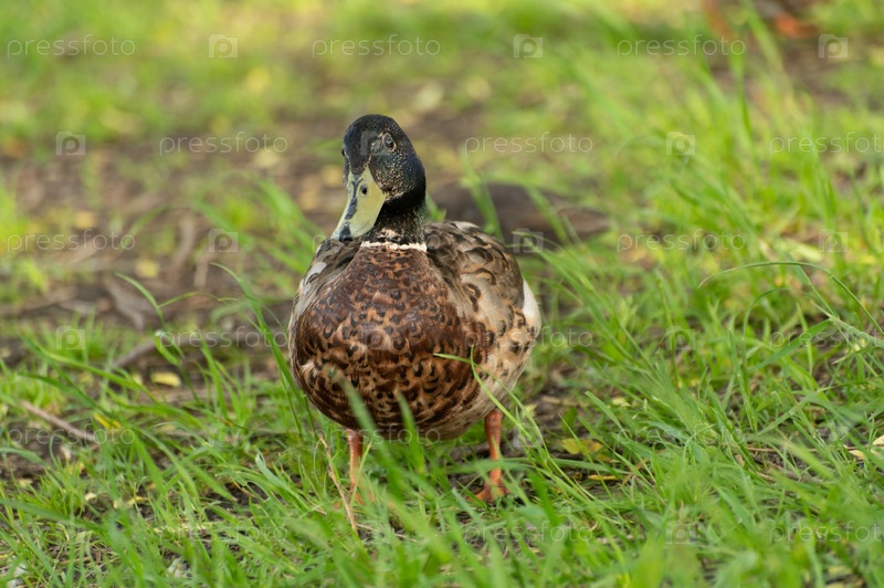Селезень с зеленой головой собирает еду в траве возле пруда