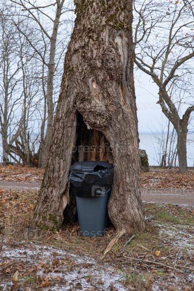 Мусорный бак, установленный внутри гниющего ствола старого тополя