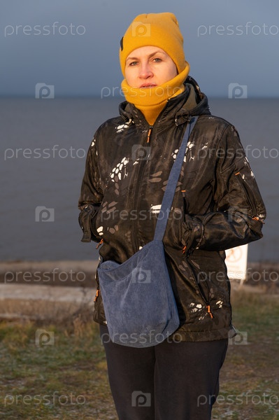 Привлекательная взрослая женщина в теплой повседневной одежде прогуливается по зимнему берегу залива