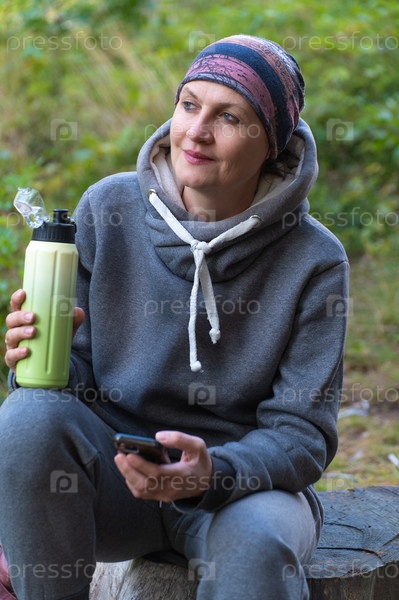 Привлекательная взрослая женщина в теплом сером спортивном костюме сидит на лесном пне
