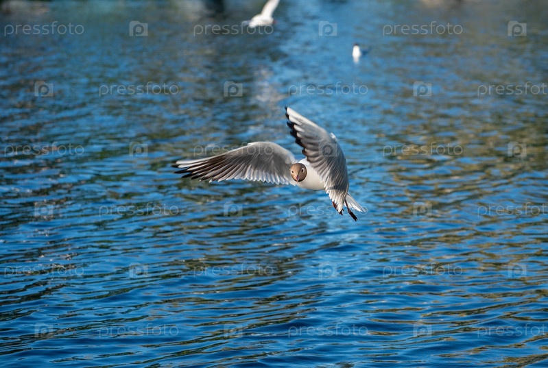 Белая чайка летит над поверхностью пруда