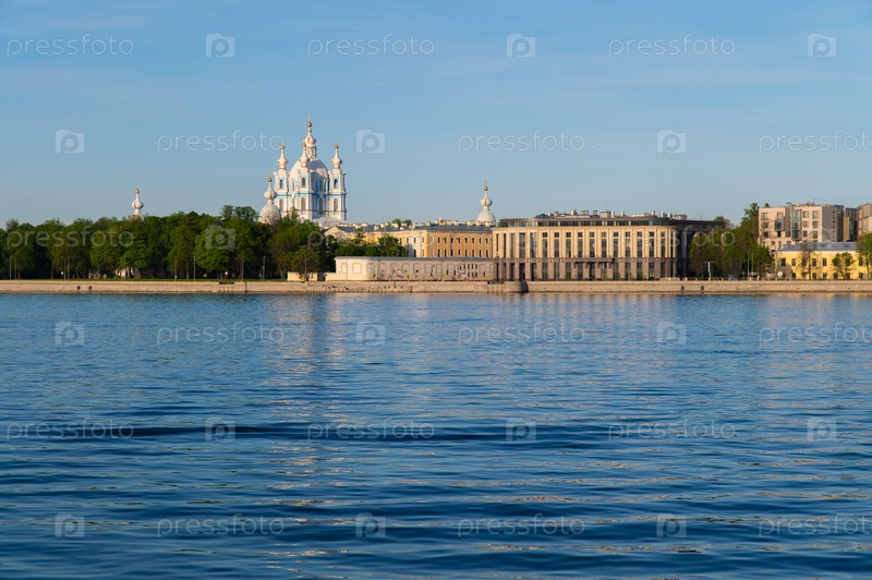 Санкт-Петербург, Россия. 20 мая 2020 г.: Гранитная набережная города с парком и собором, освещенная утренним солнцем