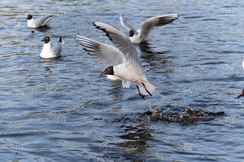 Чайки вырывают друг у друга хлеб в городском пруду
