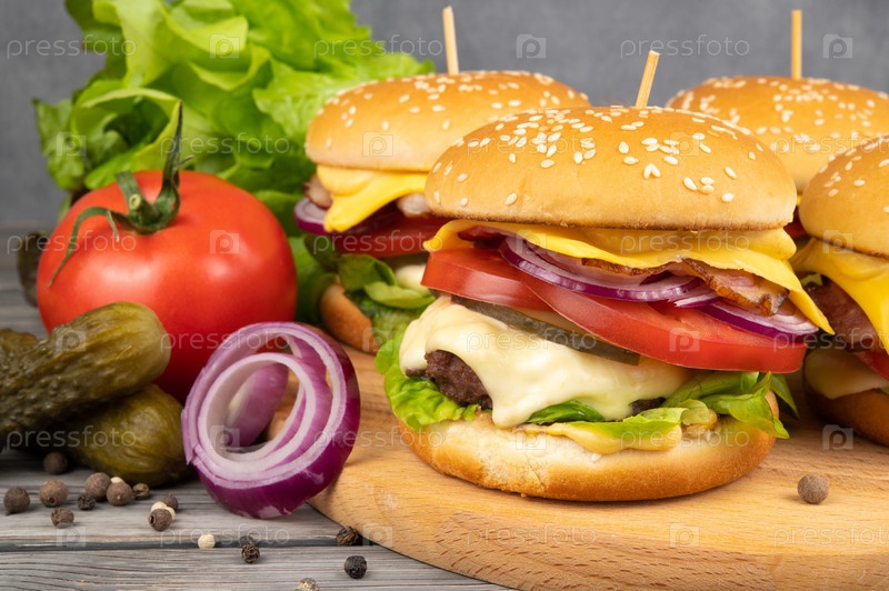 Поджаренные гамбургеры в кунжутной булочке с солеными огурцами и спелыми помидорами