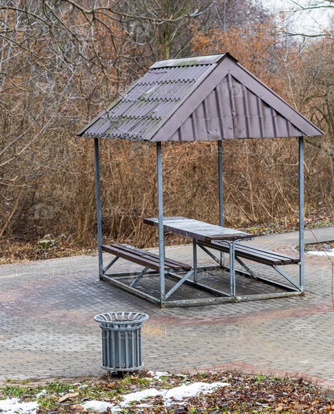 Пергола и мусорный бак в парке. На открытом воздухе