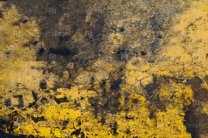 Желтая и черная краска, проступающая через потрескавшуюся бетонную поверхность, образуя абстрактный узор