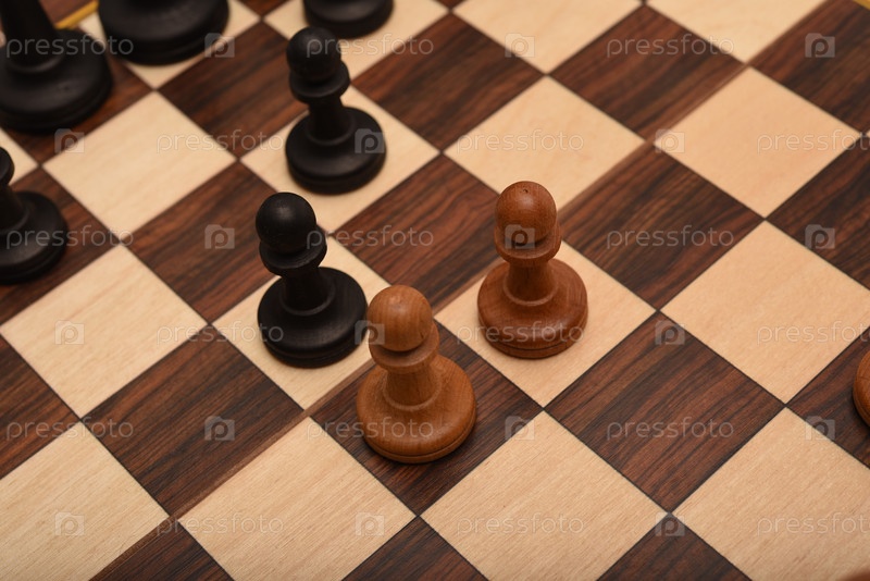 Черно-белые шахматы. Деревянные шахматы на доске. Шахматная игра