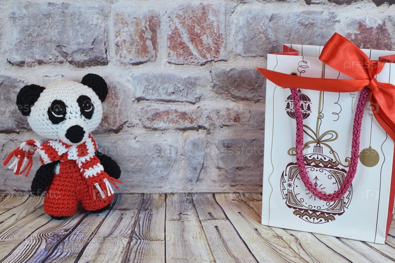 Вязаная панда стоит рядом с подарочным пакетом у кирпичной стены