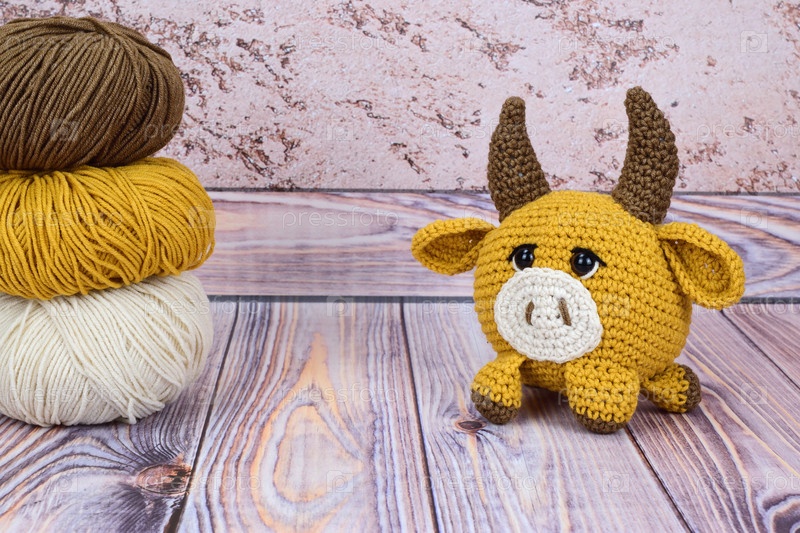 Вязаный бычок рядом с мотками пряжи, из которой он был связан