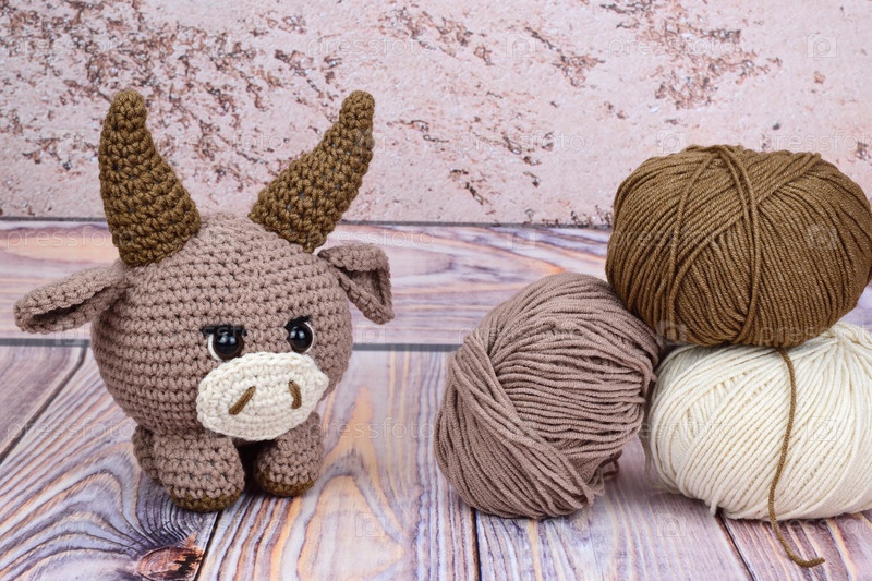 Вязаный крючком бычок рядом с клубками пряжи, из которых он сделан