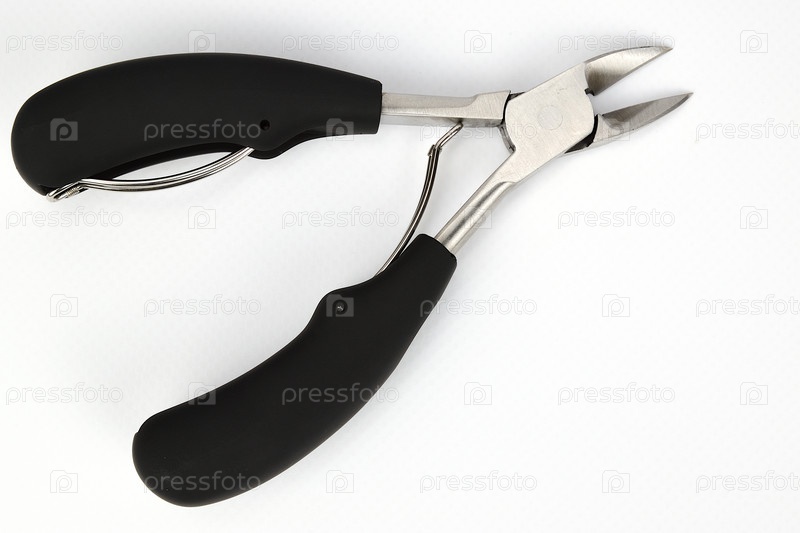 Маникюрные кусачки с черными пластиковыми ручками, изолированные на белом фоне