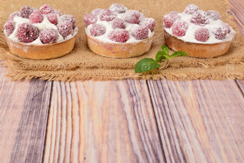 Вид сбоку на малиновые тарталетки, лежащие на циновке на деревянном столе