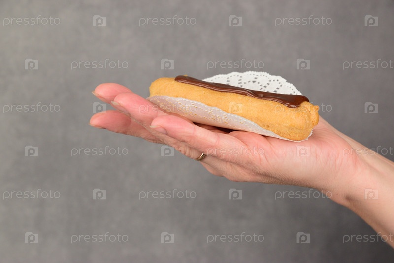 Женская рука держит пирожное «эклер» на белой узорчатой салфетке