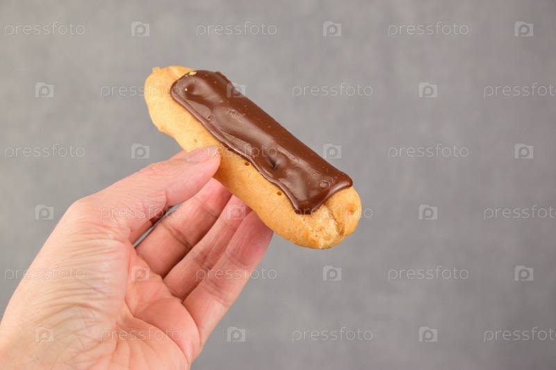 Женщина в левой руке держит эклер в шоколадной глазури