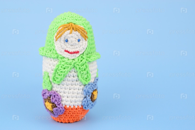 Вязаная кукла в зеленой шали, изолированная на синем фоне