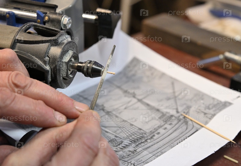 Мужские руки работают над деталями модели деревянного корабля. Мужчина держит в руках файл