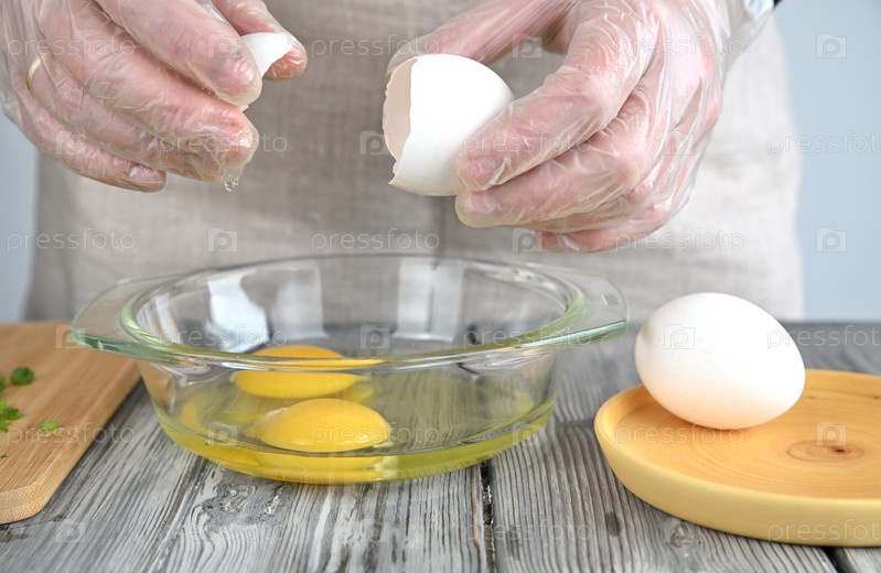 Женщина держит скорлупу от яйца, которое она вылила в прозрачную тарелку
