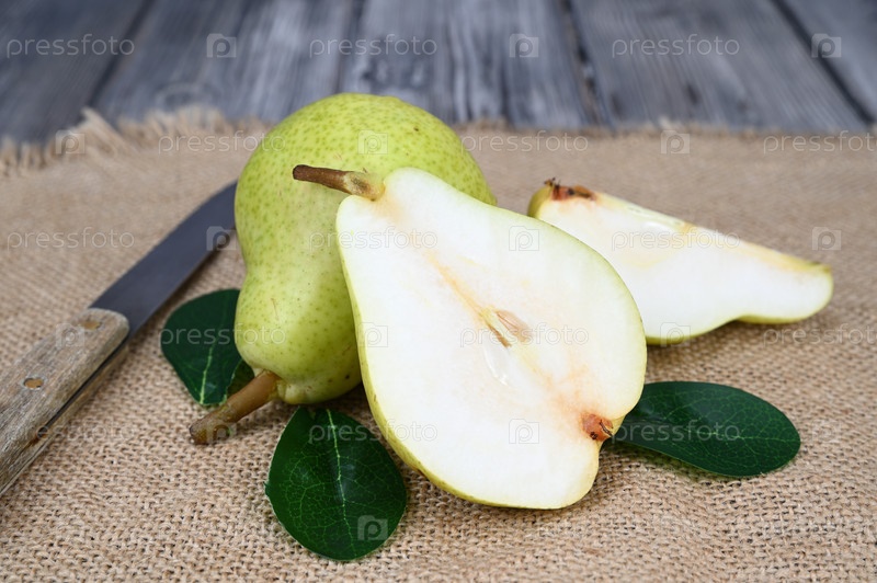Целая груша, половинка и четверть лежат рядом на мешковине. Рядом с ними лежит нож с деревянной ручкой