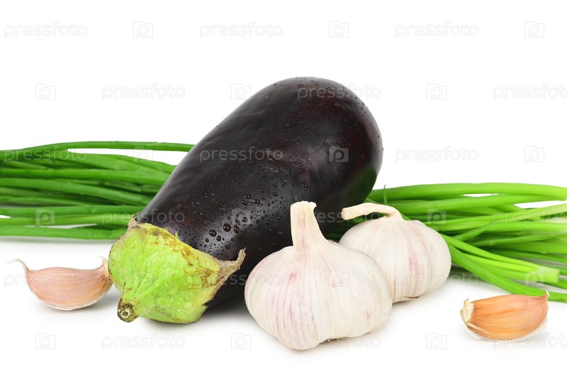 Баклажаны в капельках воды, две головки чеснока и стебли зеленого лука, изображенные на белом фоне