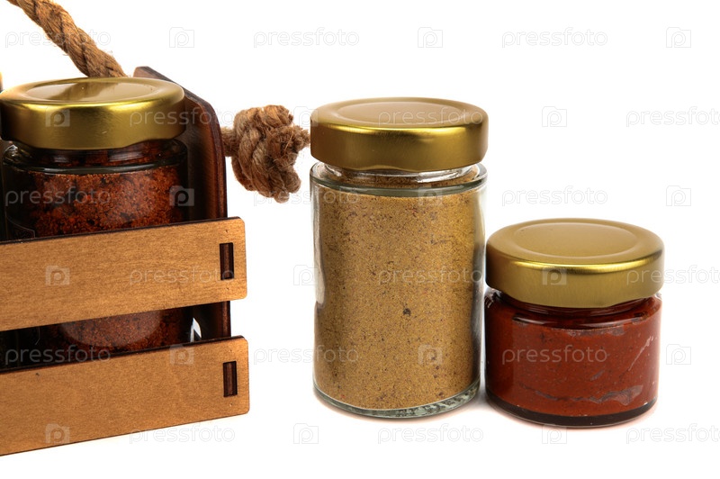Набор специй в стеклянных банках, упакованных в деревянную коробку с веревочной ручкой