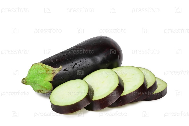 Спелый баклажан в каплях воды рядом с другим, нарезанным кружочками, изолирован на белом фоне