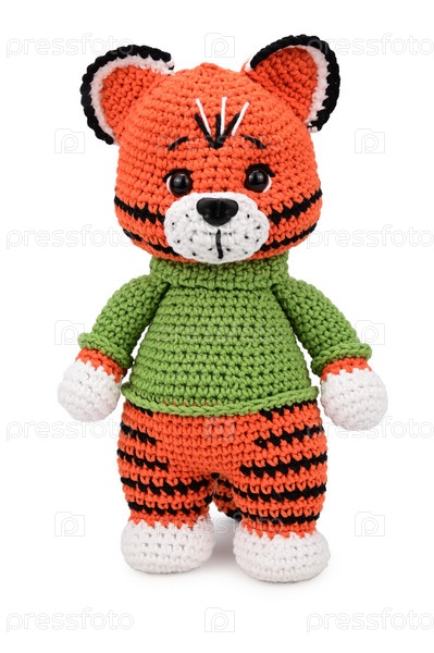 Мягкая игрушка крючком в виде тигра с белыми лапками и в зеленом свитере
