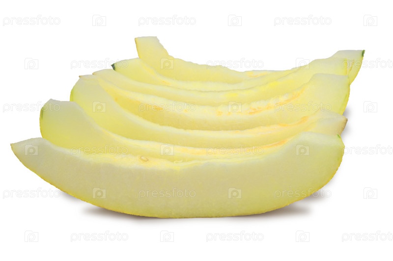 Несколько ломтиков спелой сладкой дыни в ряд один за другим. Изолированные на белом фоне