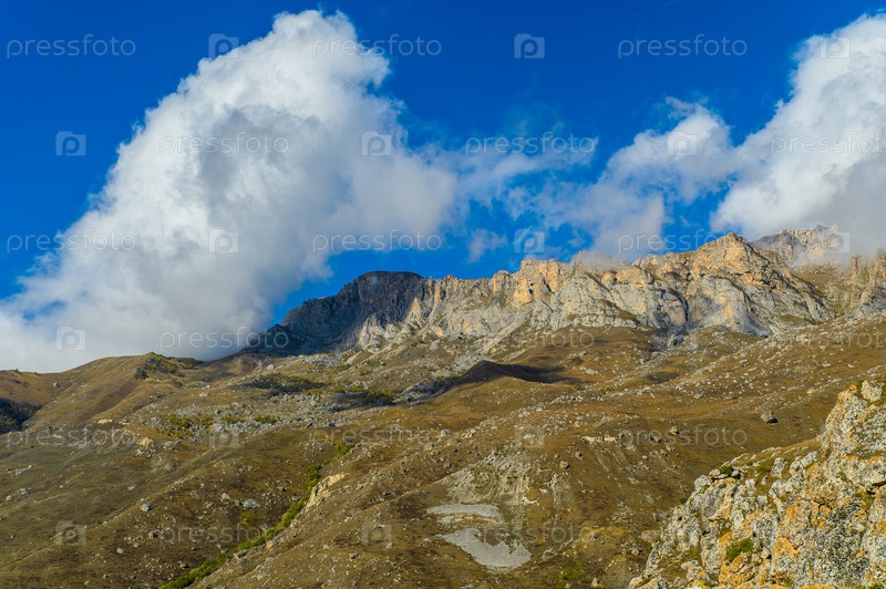Горный пейзаж с заснеженными вершинами на фоне голубого неба