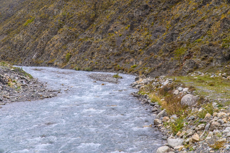 У подножия горы течет горная река с каменистыми берегами