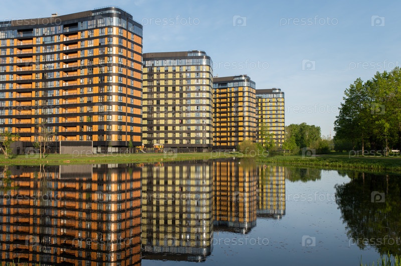 Однотипные городские дома разных цветов на берегу пруда