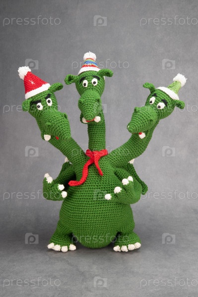 Трехглавый дракон в новогодней шапке и красном шарфе, связанный из зеленой пряжи