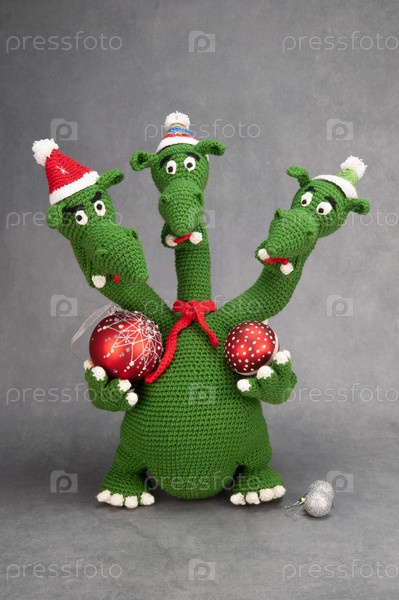Трехглавый дракон в новогодней шапке и красном шарфе, связанный из зеленой пряжи