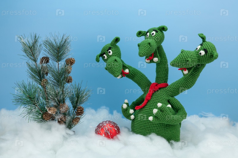 Трехглавый дракон на снегу рядом с рождественской елкой и красной елочной игрушкой