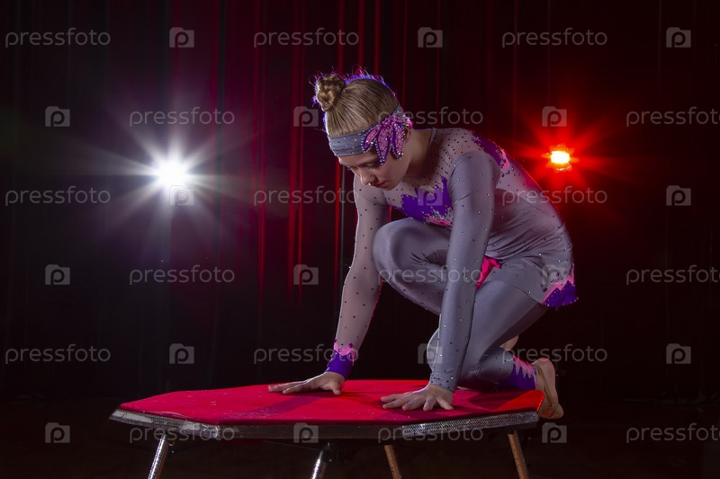 Девушка-цирковая акробатка-гимнастка на сцене на темном фоне