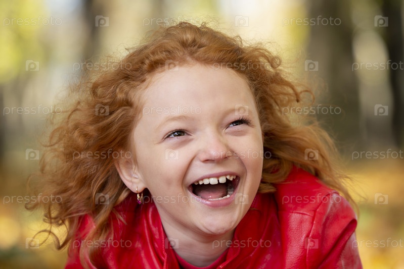 Жизнерадостная рыжеволосая девочка весело смеется на фоне осеннего парка