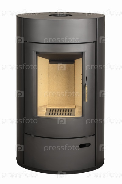 Современные камины для отопления из металла и жаропрочного стекла. Котел на твердом топливе изолирован на белом фоне
