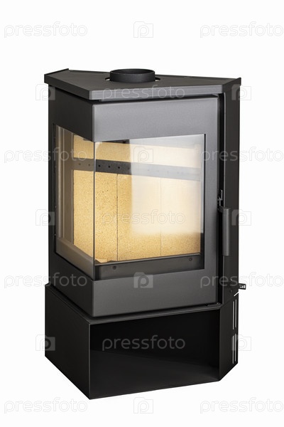 Современные камины для отопления из металла и жаропрочного стекла. Котел на твердом топливе изолирован на белом фоне
