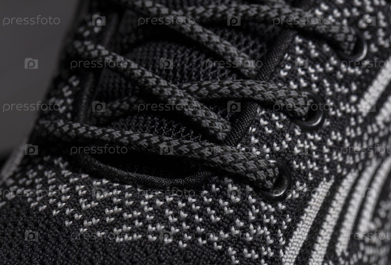 Часть серого тканевого кроссовка со шнурками на темном фоне
