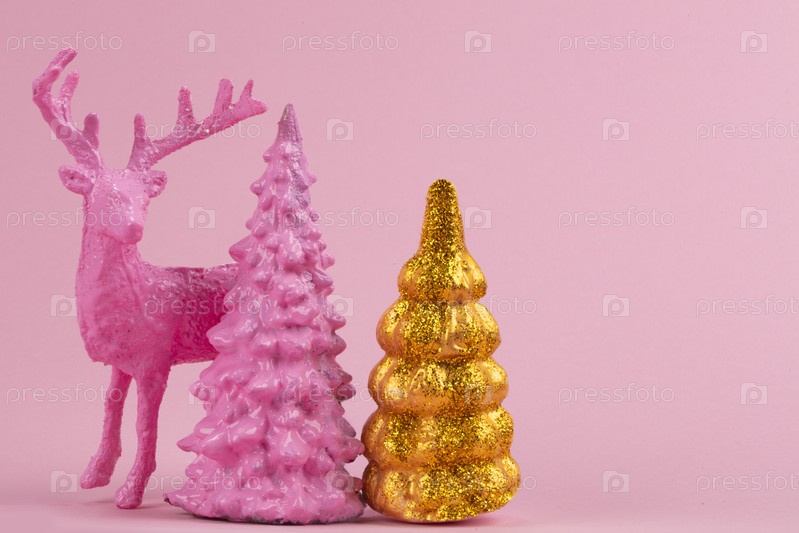 Праздничный рождественский фон. Розовый олень возле миниатюрных розовых и золотых рождественских елок