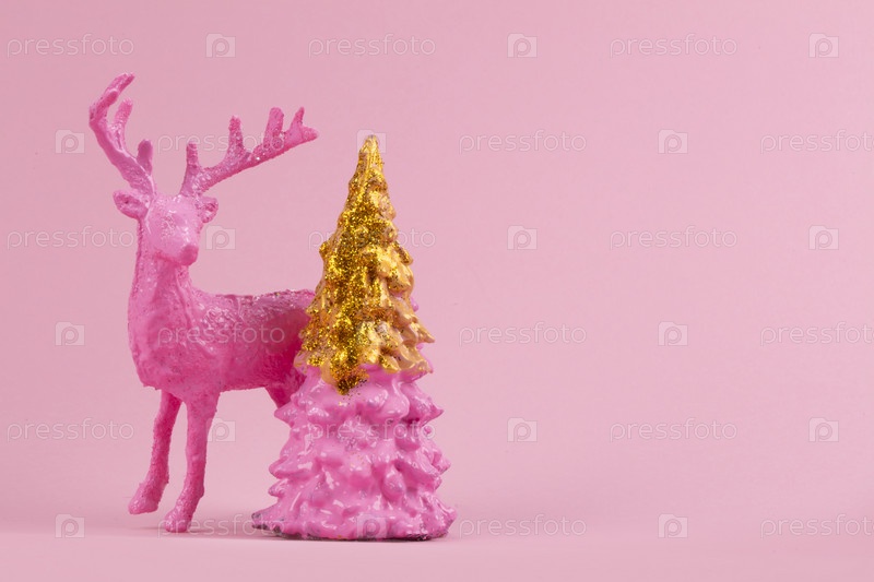 Праздничный минималистичный рождественский фон. На розовом фоне розовый олень и позолоченная рождественская елка