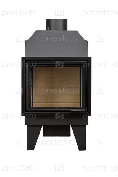 Современные камины для отопления из металла и жаропрочного стекла. Котел на твердом топливе изолирован на белом фоне
