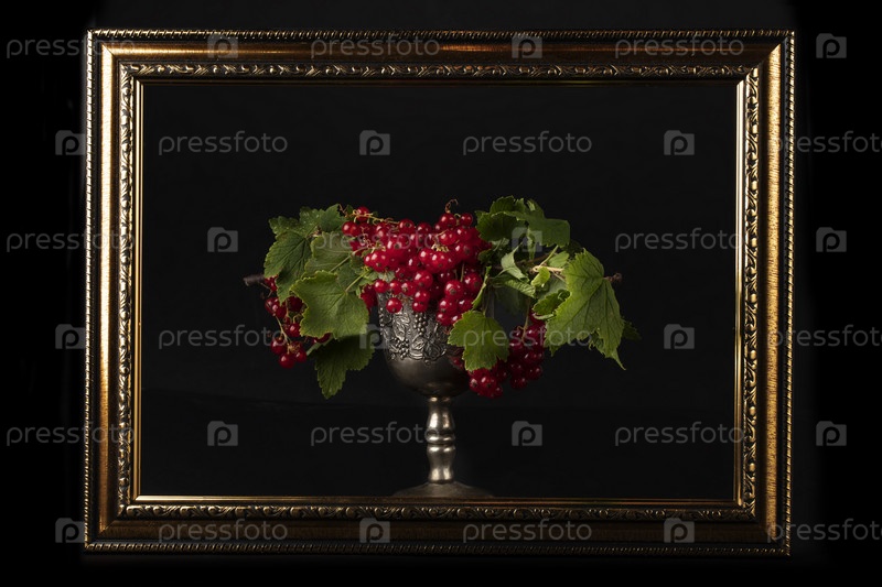 В старой раме серебряный бокал с красной смородиной. Натюрморт в старинном стиле прошлого века