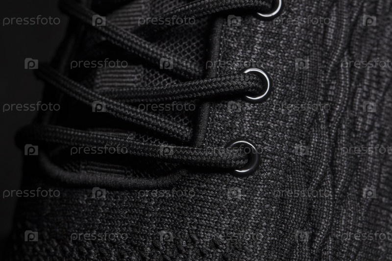 Текстура черного тряпичного кроссовка со шнурками крупным планом